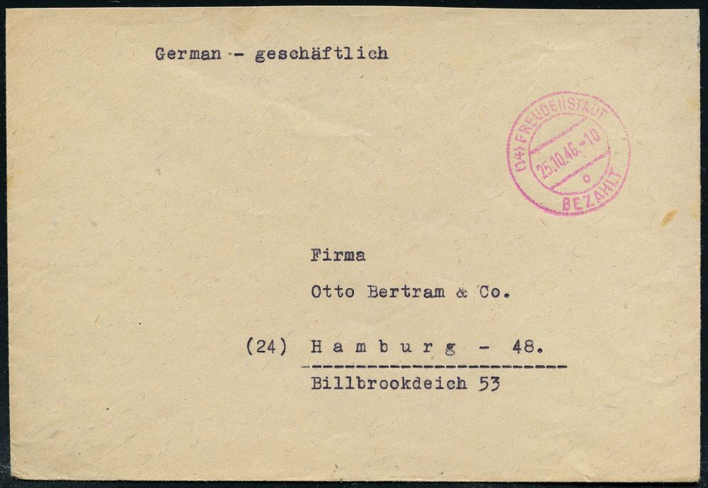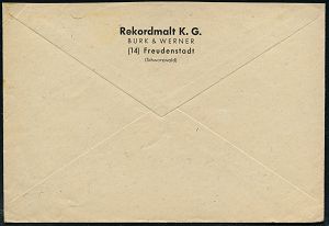 4262 | 12 € | POSTLEITRAUM 7200 (OHNE TUTTLINGEN) : (14) FREUDENSTADT/ o/ BEZAHLT 1946 (25.10.) 2K-Steg-PFS mit Uhrzeit , Firmen-Bf., rs. Abs.: Rekoordmalt K. G., BURK / WERNER.., Fern-Bf. n. Hamburg (Dü.A-7, Nr.32) | ![]() ![]() | |