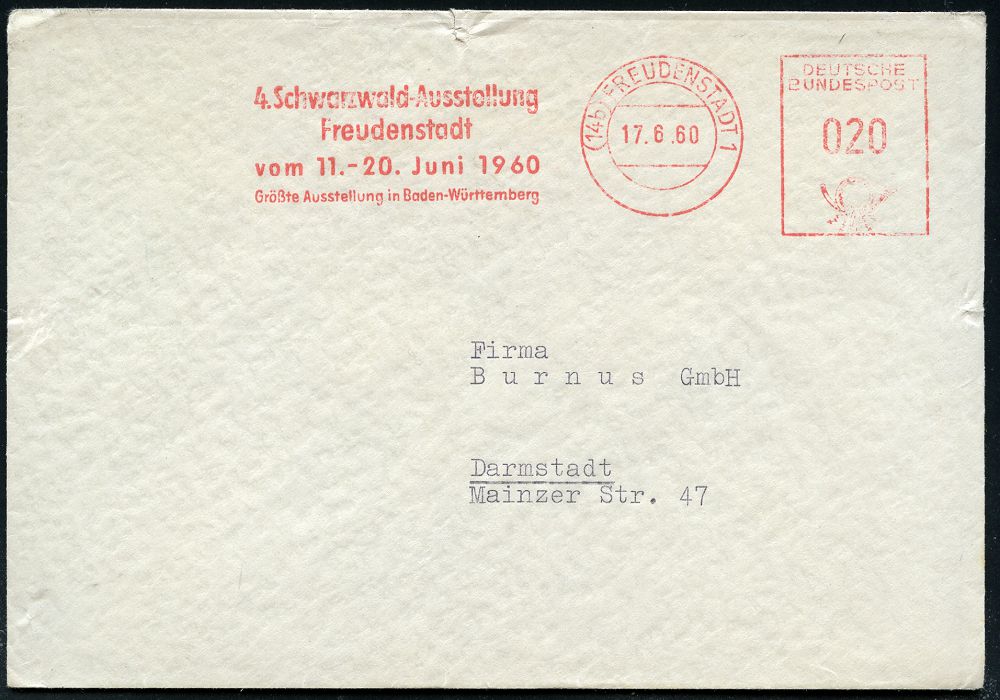 4268 | 16 € | POSTLEITRAUM 7200 (OHNE TUTTLINGEN) : (14b) FREUDENSTADT 1/ 4.Schwarzwald-Ausstellung/ ../ vom 11.-20.Juni 1960.. 1960 (17.6.) kommunaler AFS Francotyp "Posthorn" auf Fern-Bf. (Dü.E-26, nur kurze Verwendungszeit) | ![]() | |