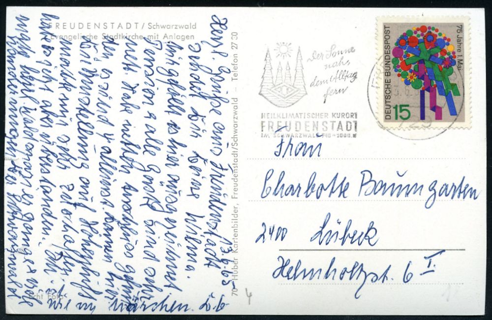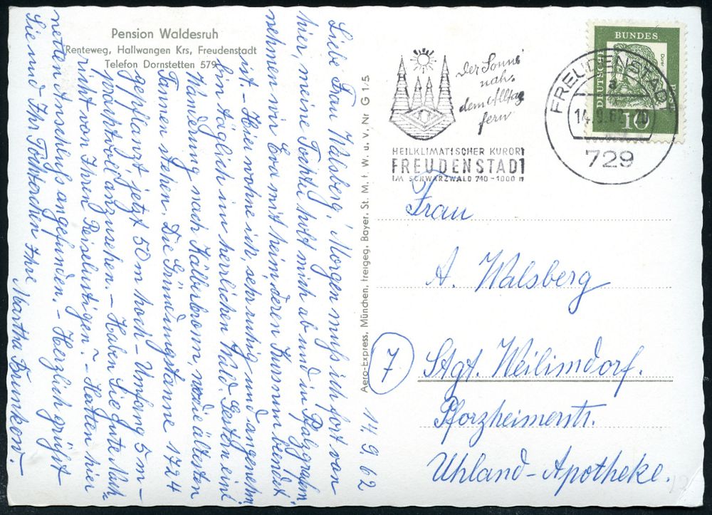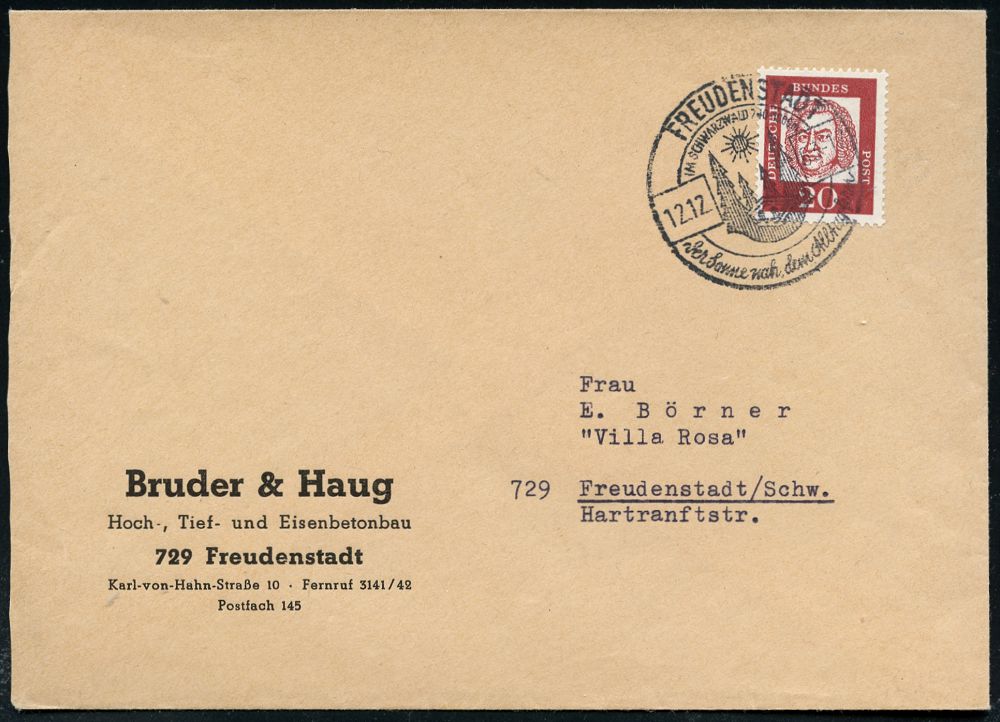 4272 | 12 € | POSTLEITRAUM 7200 (OHNE TUTTLINGEN) : FREUDENSTADT/ IM SCHWARZWALD../ der Sonne nach.. 1962 (12.12.) aptierter HWST = alte PLGZ entfernt (Sonne, 4 Tannen) Firmen-Bf.: Bruder & Haug, Hoch-, Tie- u. Eisenbetonbau.. (Bo.14 aptiert) | ![]() | |