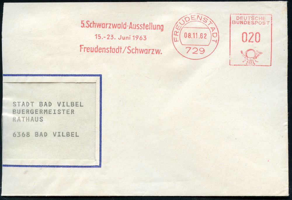 4270 | 10 € | POSTLEITRAUM 7200 (OHNE TUTTLINGEN) : 729 FREUDENSTADT/ 5.Schwarzwald-Ausstellung/ 15.-23.Juni 1963.. 1962 (8.11.) kommunaler AFS Francotyp "Posthorn" auf Teil-Bf. (Dü.E-26) | ![]() | |