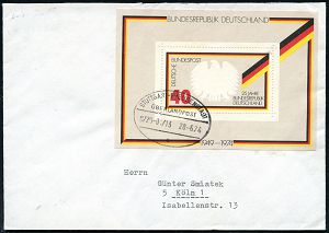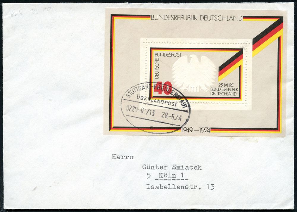 4275 | 14 € | POSTLEITRAUM 7200 (OHNE TUTTLINGEN) : STUTTGART-FREUDENSTADT/ ÜBERLANDPOST/ 0720-01/ 13/ a 1974 (28.6.) Ovalstempel = mobiles Postamt im Überland-Postomnibus, Kurs 13 klar auf EF 40 Pf. Block "25 Jahre BRD", klar gest. Fern-Bf. (Mi.Bl. 10 EF + 6.- EUR) | ![]() | |
