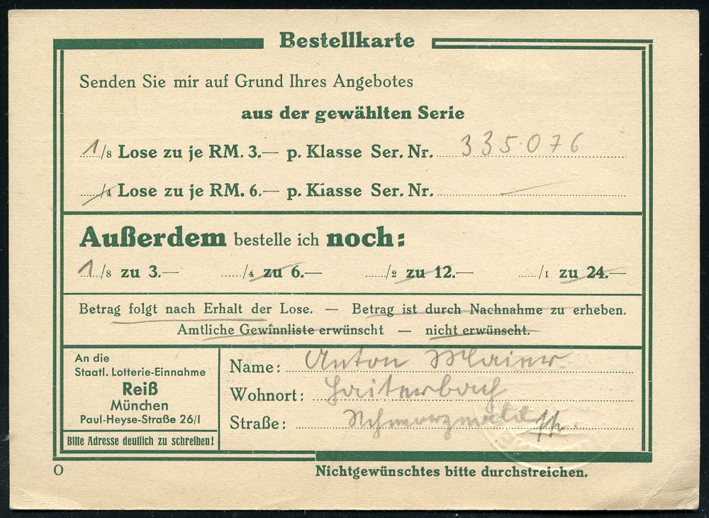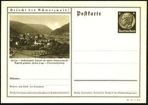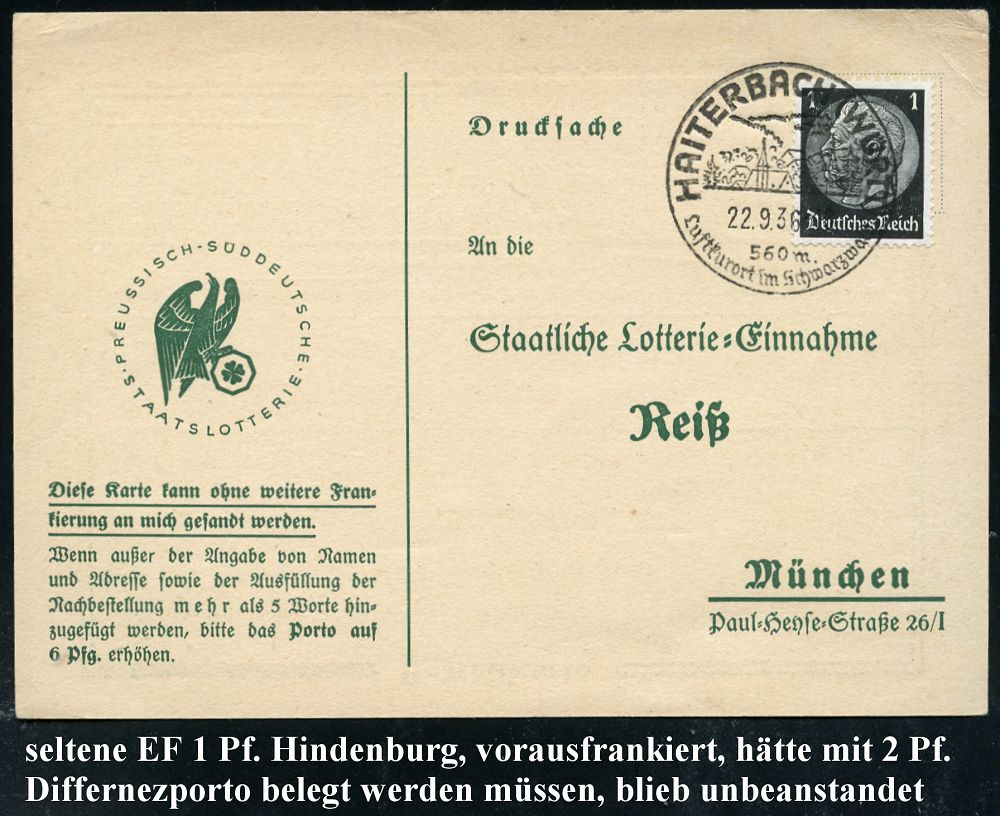 4279 | 50 € | POSTLEITRAUM 7200 (OHNE TUTTLINGEN) : HAITERBACH (WÜRTT)/ ..Luftkurort im Schwarzwald 1936 (22.9.) HWSt (Landschaft) auf EF 1 Pf. Hindenbg. auf vorausfrankierter Lotto-Werbe-Antwortkarte, ohne Nachgebühr (wäre 2 Pf. gewesen = Drs.-Porto) n. München, sehr seltener Bedarf! (Bo.1, Erstjahr) | ![]() ![]() | |