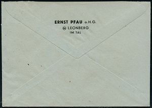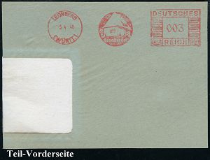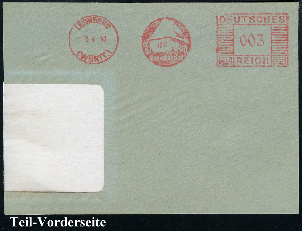 4290 | 14 € | POSTLEITRAUM 7200 (OHNE TUTTLINGEN) : LEONBERG/ (WÜRTT)/ Leonberger 1940 (5.4.) AFS Francotyp "Mäanderrechteck" (Einfamilienhaus) = Bausparkasse, Teil-Vorderseite (Dü.E-2CEo) | ![]() | |