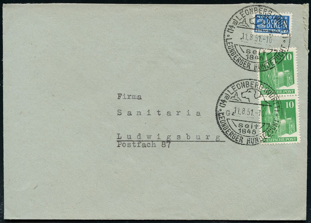 4292 | 16 € | POSTLEITRAUM 7200 (OHNE TUTTLINGEN) : (14a) LEONBERG(WÜRTT)/ seit/ 1846/ LEONBERGER HUNDEZUCHT 1951 (11.8.) HWSt (= Leonberger Hund) klar auf Bauten-Frankatur, rs. Abs.-Vordruck, Firmen-Bf.: ERNST PFAU o.HG. (Bo.2) | ![]() ![]() | |