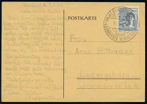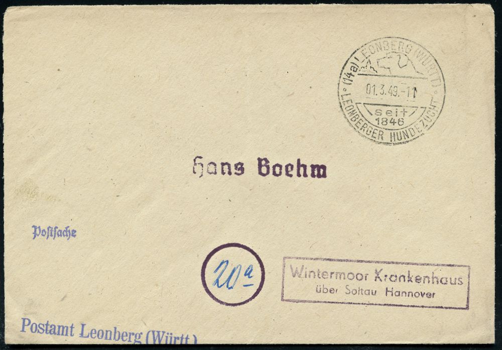 4294 | 15 € | POSTLEITRAUM 7200 (OHNE TUTTLINGEN) : (14a) LEONBERG(WÜRTT)/ seit/ 1846/ LEONBERGER HUNDEZUCHT 1949 (1.3..) HWSt (Leonberger) + viol. 1L: Postamt Leoberg (Württ) auf Postdienst-Antwort-Bf. (schwache Mittelfalte) + 1L: Postsache (Bo.2) | ![]() | |