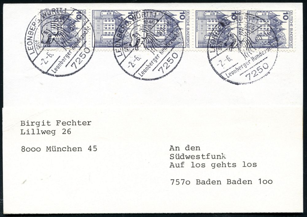 4297 | 12 € | POSTLEITRAUM 7200 (OHNE TUTTLINGEN) : 7250 LEONBER,WÜRTT 1/ Leonberger Hundezucht 1980 (2.6.) HWSt (Leonberger Hund) 3x klar auf Inl.-Karte (Bo.9, Type II) | ![]() | |