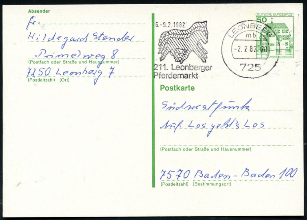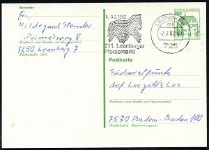 4298 | 5 € | POSTLEITRAUM 7200 (OHNE TUTTLINGEN) : 725 LEONBERG/ mb/ 211.Leonberg/ Pferdemarkt 1982 (2.2.) MWSt = 3 stilis. Pferde , Bedarfs-Kt. (Bo.48 A) | ![]() | |