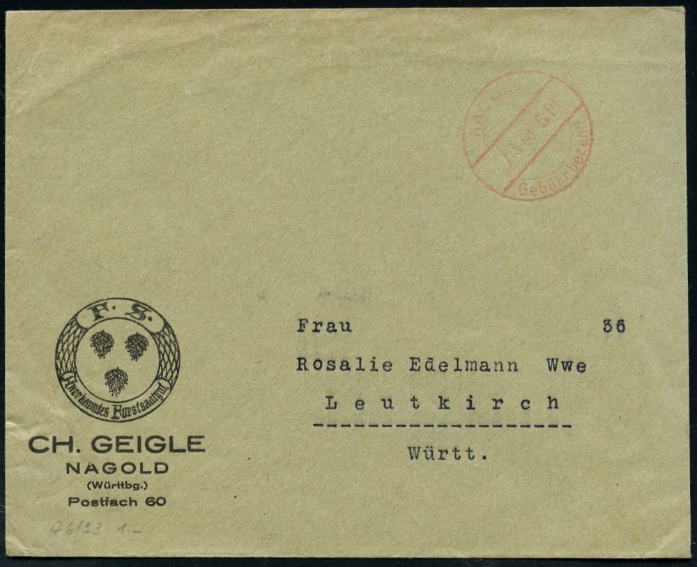 4301 | 15 € | POSTLEITRAUM 7200 (OHNE TUTTLINGEN) : NAGOLD/ Gebühr bezahlt 1930 (7.3.) 1K-Brücken-PFS 5 Pf. auf Firmen-Bf.: CH. GEIGLE Anerkanntes Forstsaatgut (Logo) Fern-Bf., vergl. nachfolgende Kat.-Nrn.! (Dü.A-6, Nr.25) | ![]() | |