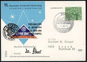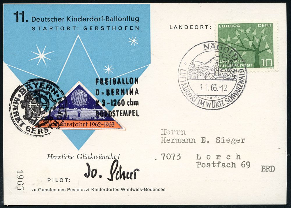4307 | 15 € | POSTLEITRAUM 7200 (OHNE TUTTLINGEN) : NAGOLD/ LUFTKURORT.. 1963 (1.1.) aptierter HWSt = alte PLGZ entfernt + Dreieck-Ballon-Vignette "3. Neujahrsfahrt 1952-63" mit viol. Ballon-HdN, Color-Ballon-Ak.: 11. Deutscher Kinderdorf-Ballonflug (Bo.2, aptiert, nur 1962 bis Anfang 1963) | ![]() ![]() | |