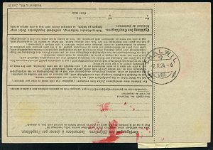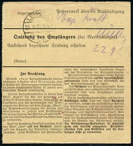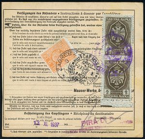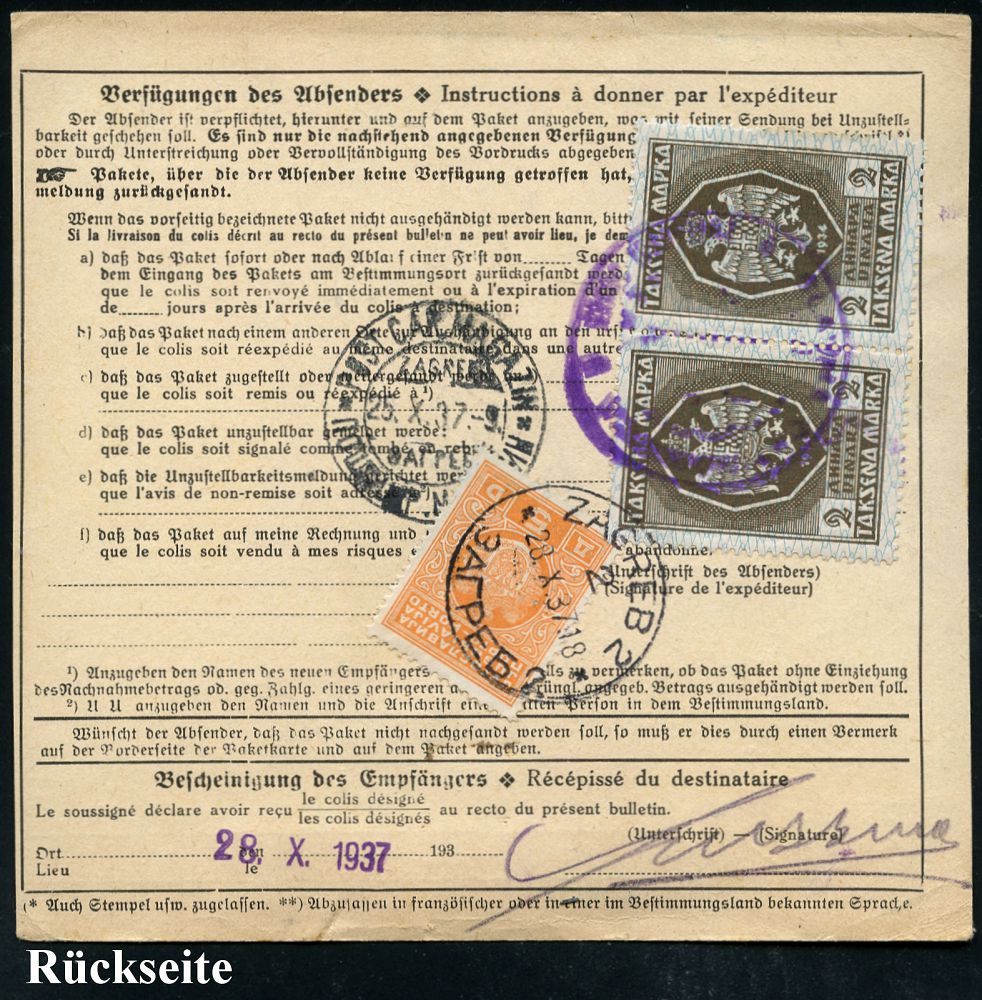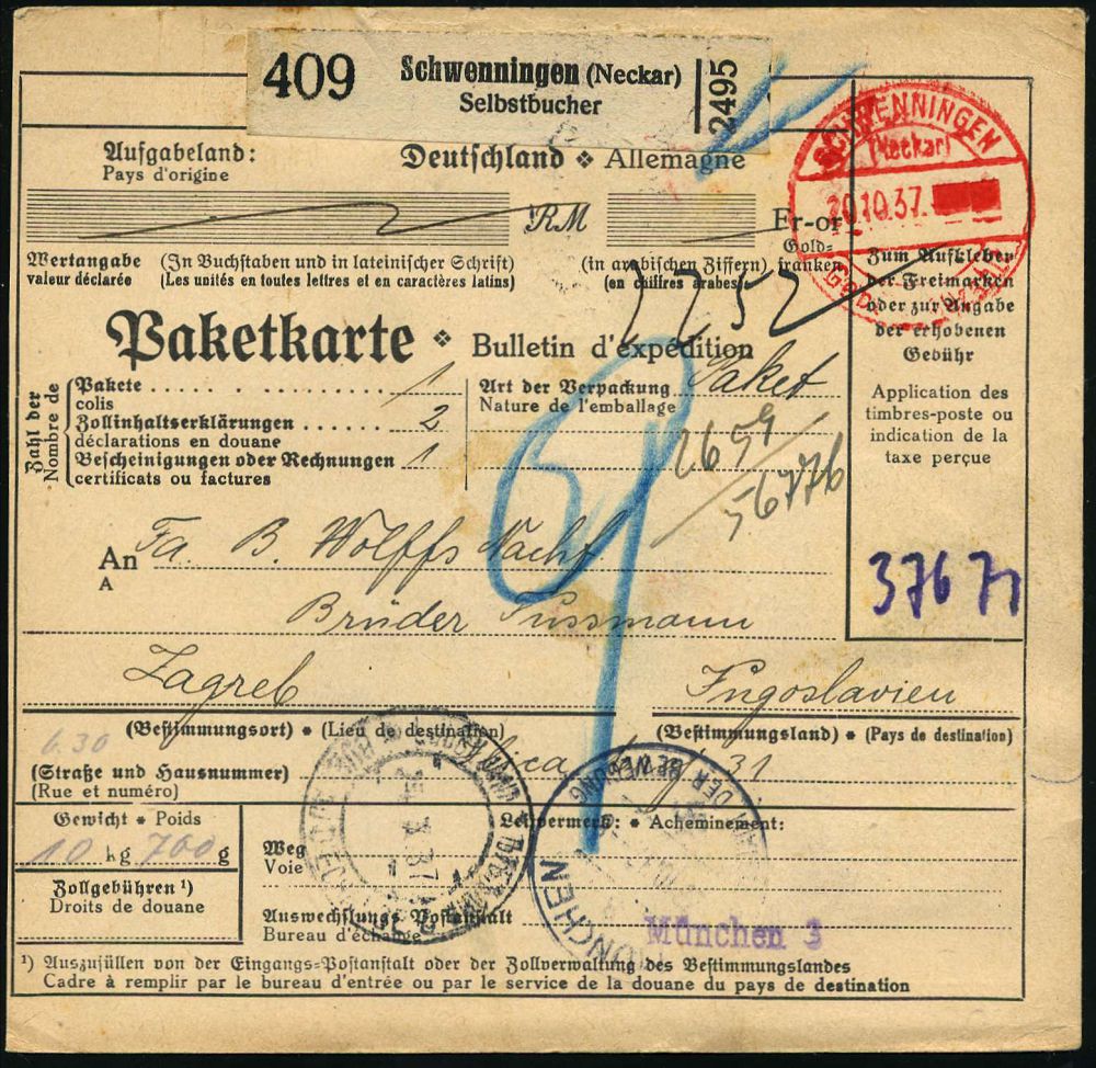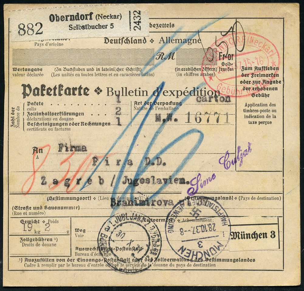 4313 | 28 € | POSTLEITRAUM 7200 (OHNE TUTTLINGEN) : (OBERNDORF) (Neckar)/ **/ Gebühr bezahlt 1937 (26.10.) Doppeloval-PFS + schw. Selbstbucher-Paketzettel: Oberndorf (Neckar)/ Selbstbucher 5 + TS München 3, klar gest. Ausl.-Selbstbucher-Paketkarte n. Zagreb, rs. jugoslaw. Porto- u. Fiskalmarken | ![]() ![]() | |