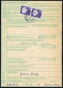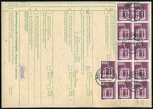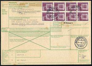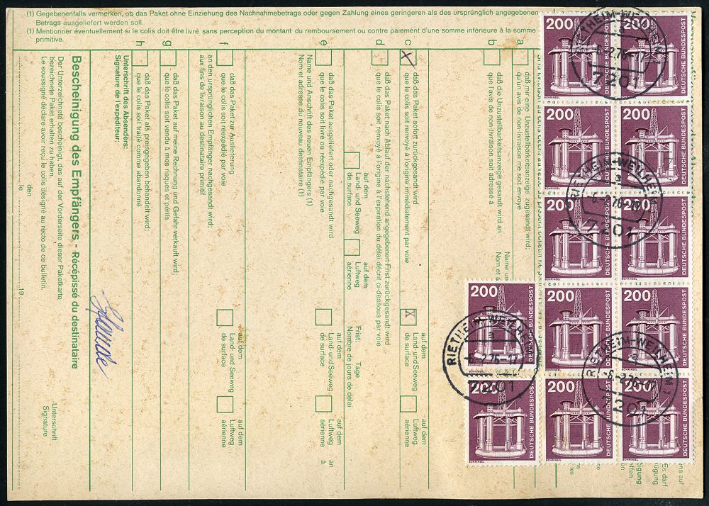 4322 | 25 € | POSTLEITRAUM 7200 (OHNE TUTTLINGEN) : 7201 RIETHEIM-WEILHEIM 1/ a 1976 (6.2.) 1K-Segment mehrfach auf MeF 200 Pf. Technik Erdöl-Plattform, vs. 8er-Block + rs. 12 weitere 200 Pf. in Einheiten = 4000 Pf. ! + brauner Paketzettel: 7201 Rietheim-/Weilheim 1, klar gest. Ausl.-Paketkarte n. USA, sehr seltene Portostufe! (Mi.858 MeF + 25.- EUR) | ![]() ![]() | |