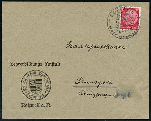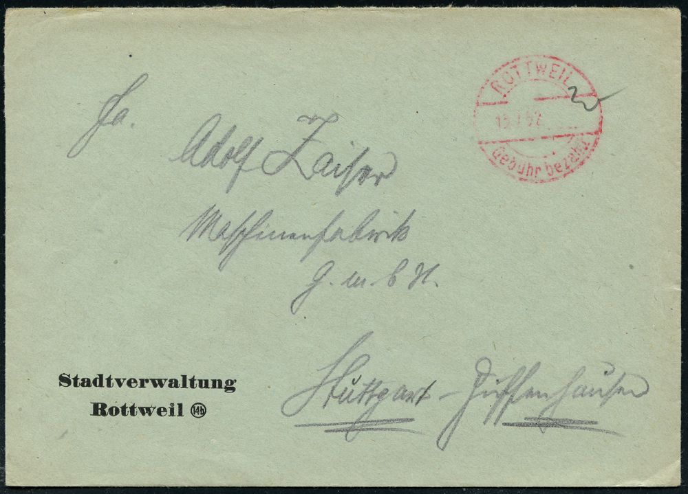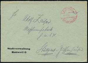 4326 | 8 € | POSTLEITRAUM 7200 (OHNE TUTTLINGEN) : ROTTWEIL/ Gebühr bezahlt 1932 (15.1.) 1K-Brücken-PFS ohne Wertziffer u. Uhrzeit auf Dienst-Bf.: Stadtveraltung.. (Dü.A-6, Nr.22) | ![]() | |