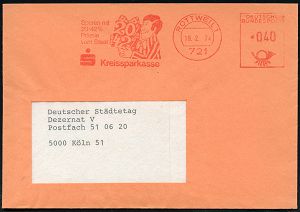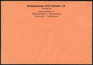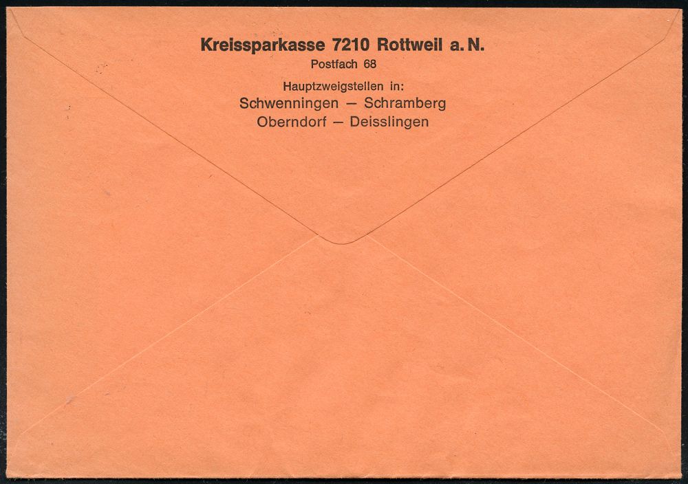 4330 | 12 € | POSTLEITRAUM 7200 (OHNE TUTTLINGEN) : 721 ROTTWEIL/ Sparen mit/ 20-42%/ ,,Kreissparkasse 1974 (19.2.) AFS Francotyp "Posthorn" (Mann mit Prozent-Paket) rs. Abs.-Vordruck, Fern-Bf. (Dü.E-26) | ![]() ![]() | |