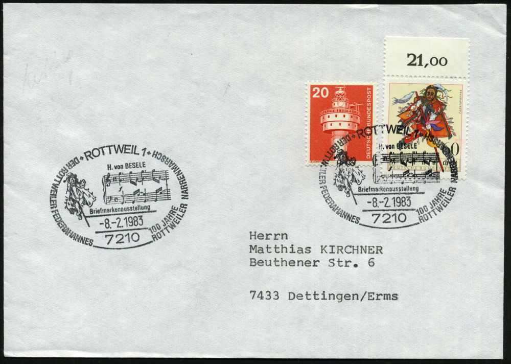4335 | 10 € | POSTLEITRAUM 7200 (OHNE TUTTLINGEN) : 7210 ROTTWEIL 1/ ..100 JAHRE/ ROTTWEILER NARRENSPRUNG 1983 (8.2.) SSt = Narrensprung (u. 2 Notenzeilen) auf 60 Pf. Narrensprung (Mi.1167 = FDC) u.a. Inl.-Bf. (Bo.24) | ![]() | |