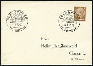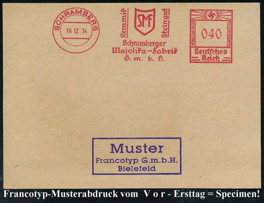 4342 | 35 € | POSTLEITRAUM 7200 (OHNE TUTTLINGEN) : SCHRAMBERG/ Keramik/ Steingut/ Schramberger/ Majolika-Fabrik/ GmbH 1934 (19.12.) AFS-Musterabdruck Francotyp "Hakenkreuz" (Monogr.-Logo) glasklar gest. Francotyp-Musterblatt vom V o r - Ersttag! (mit Attest), selten! (Dü.E-3CEo) | ![]() ![]() | |