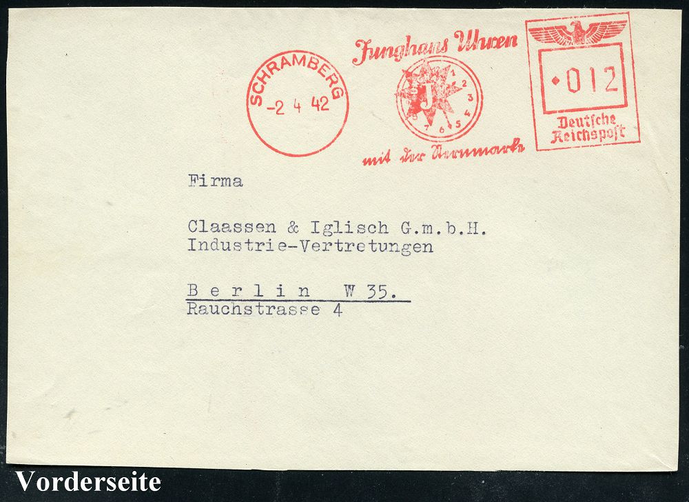 4346 | 14 € | POSTLEITRAUM 7200 (OHNE TUTTLINGEN) : SCHRAMBERG/ Junghans Uhren/ mit der Sternmarke 1942 (2.4. .) AFS = Zifferblatt (m.Stern-Logo) klar gest. Bedarfs-Vorderseite (Dü.E-5DG) | ![]() | |