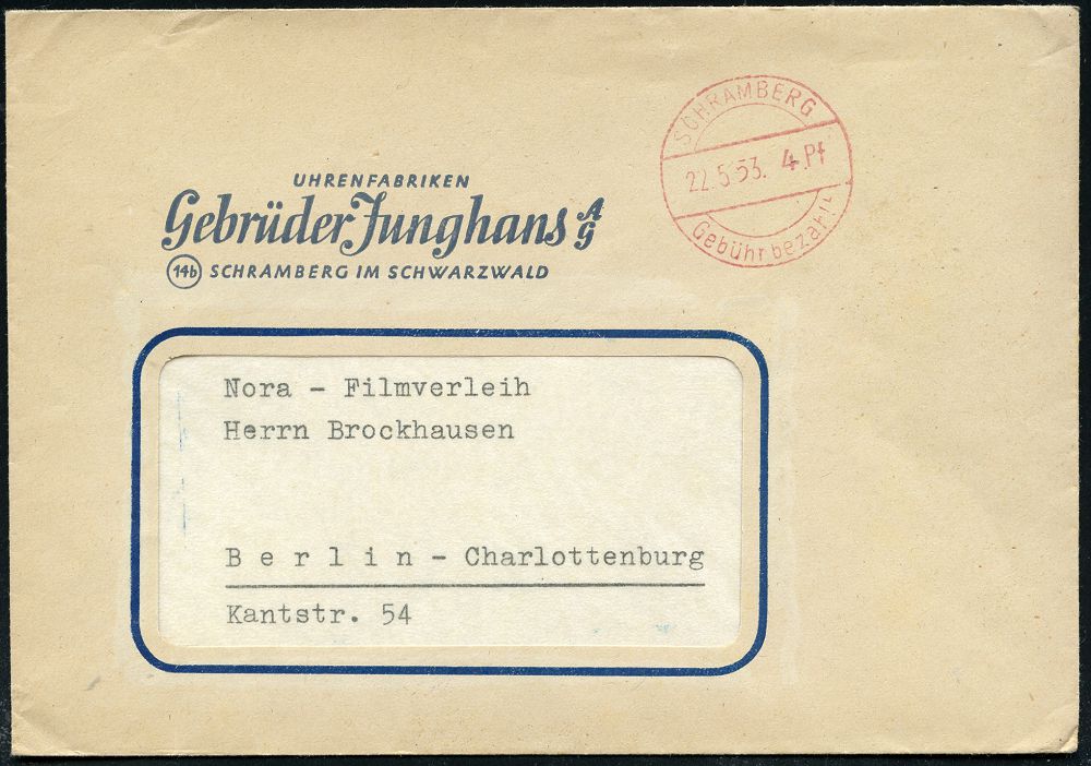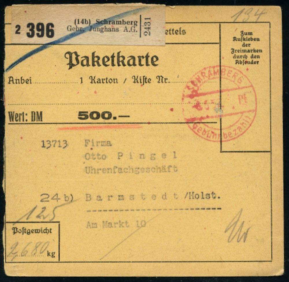 4349 | 14 € | POSTLEITRAUM 7200 (OHNE TUTTLINGEN) : SCHRAMBERG/ 4 Pf./ Gebühr bezahlt 1953 (22.5.) 1K-Brücken-PFS mit Wertangabe auf Firmen-Bf.: UHRENFABRIKEN Gebr. Junghans AG.. (Dü.A-6, Nr.25) | ![]() | |