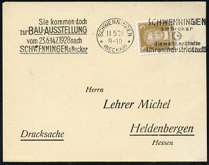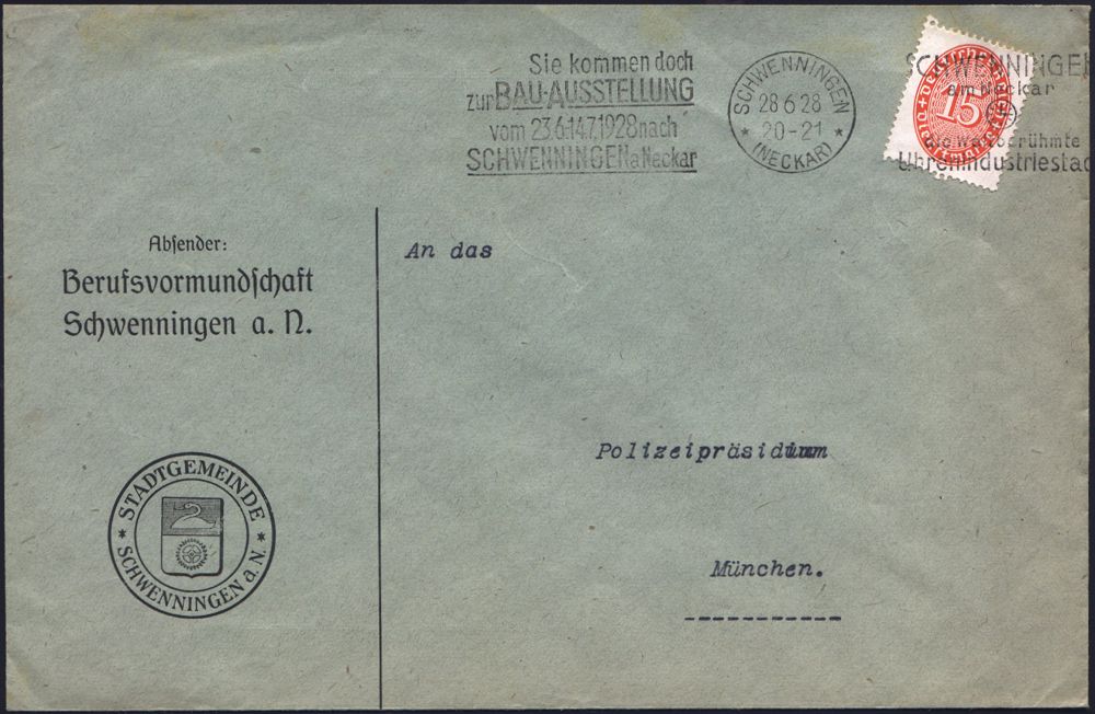 4359 | 23 € | POSTLEITRAUM 7200 (OHNE TUTTLINGEN) : SCHWENNINGEN/ *(NECKAR)*/ ..BAU-AUSSTELLUNG/ vom 23.6.-14.7. 1928 (28.6.) MaWSt (2 Texte) auf EF 15 Pf. Dienst (Mi.D 118) dekorativer, Kommunal-Bf. STADTGEMEINDE, Berufsvormundschaft (Stadtwappen) n. München (Bo.6E5) | ![]() | |