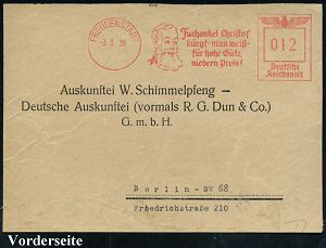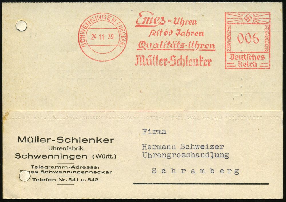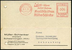 4366 | 18 € | POSTLEITRAUM 7200 (OHNE TUTTLINGEN) : SCHWENNINGEN (NECKAR)/ Emes-Uhren/ seit 60 Jahren/ ..Müller-Schlenker 1940 (30.4.) Jubil.-AFS Francotyp "Hakenkreuz" , klar gest. Firmen-Kt. (Reg.-Lochung geschl.) n. Schramberg (Dü.E-3CEo) | ![]() | |