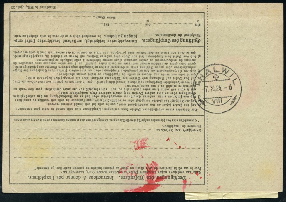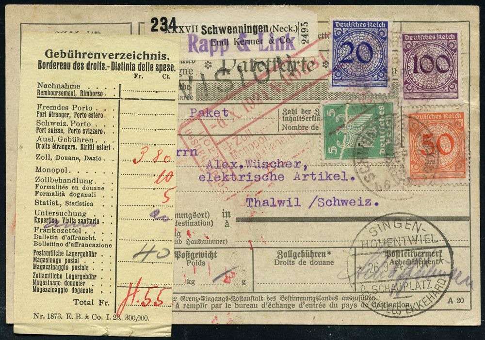 4353 | 28 € | POSTLEITRAUM 7200 (OHNE TUTTLINGEN) : SCHWENNINGEN (NECKAR)/ b* 1924 (24.9.) 1K auf Korbdeckel 20 Pf., 50 Pf. u. 100 Pf. und 5 Pf. Adler (defekt) + schw. , provis. Paketzettel: Schwenningen (Neck.)/ Kermer & Co. überstempelt mit "Rapp & Link" + TS: SINGEN-HOHENTWIEL/ SCHAUPLATZ/ ECKART SCHEFFELS (Bo.2 , nur 1923-24) + Gebührenzettel Ausl.-Selbstbucher-Paket-Kt. in die Schweiz (Mi.341/43 u.a.) | ![]() ![]() | |