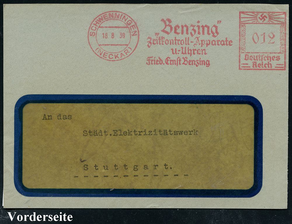4365 | 14 € | POSTLEITRAUM 7200 (OHNE TUTTLINGEN) : SCHWENNINGEN/ (NECKAR)/ "Benzing"/ Zeitkontroll-Apparate/ u.Uhren.. 1939 (18.8.) AFS Francotyp "Hakenkreuz" auf kleiner Vorderseite (Dü.E-3CEo) | ![]() | |