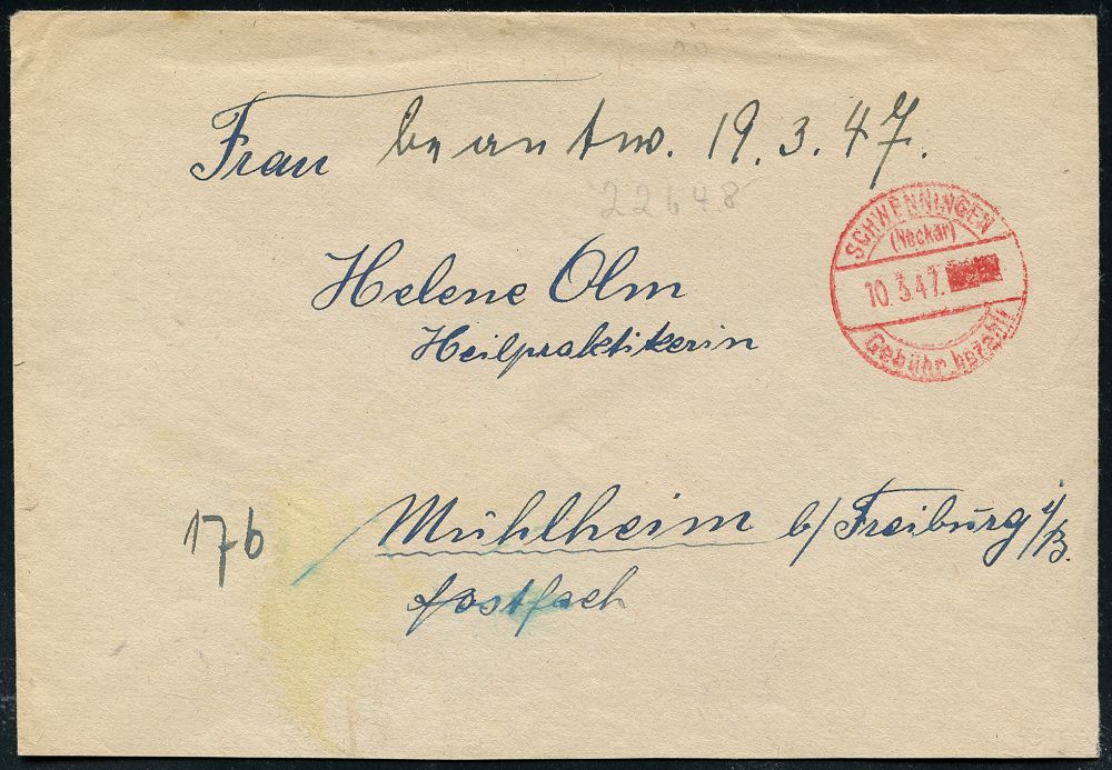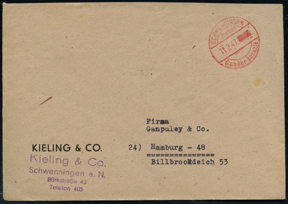4374 | 12 € | POSTLEITRAUM 7200 (OHNE TUTTLINGEN) : SCHWENNINGEN/ (Neckar)/ Gebühr bezahlt 1947 (11.2.) 1K-Brücken-PFS mit geblockter Wertziffer klar auf Firmen-Bf.: KIELING & CO.. (rs. Riß geschl.) (Dü.A-6, Nr.25) | ![]() | |