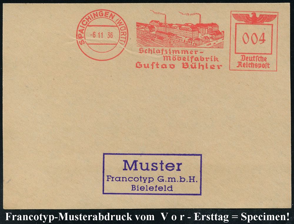 4388 | 35 € | POSTLEITRAUM 7200 (OHNE TUTTLINGEN) : SPAICHINGEN (WÜRTT)/ Schlafzimmer-/ Möbelfabrik/ Gustav Bühler 1936 (6.11.) AFS-Musterabdruck Francotyp "Reichsadler" (Fabrik-Anlagen) glasklar gest. Francotyp-Musterblatt vom V o r - Ersttag ! (m. Attest), selten! (Dü.E-5CEo) | ![]() ![]() | |