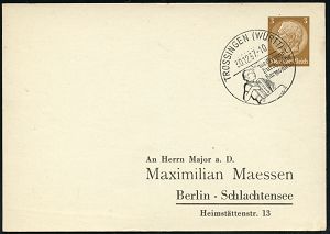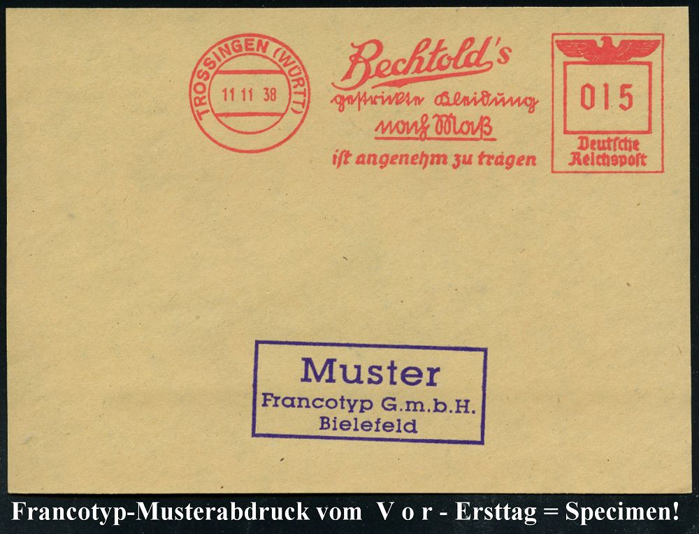 4391 | 35 € | POSTLEITRAUM 7200 (OHNE TUTTLINGEN) : TROSSINGEN (WÜRTT)/ Bechtold´s/ ..Kleidung nach Maß.. 1938 (11.11.) AFS-Musterabdruck "Reichsadler" , Text teils in Sütterlin, glasklar gest. Francotyp-Musterblatt vom V o r - Ersttag! (mit Attest), selten! (Dü.E-5CGo) | ![]() ![]() | |
