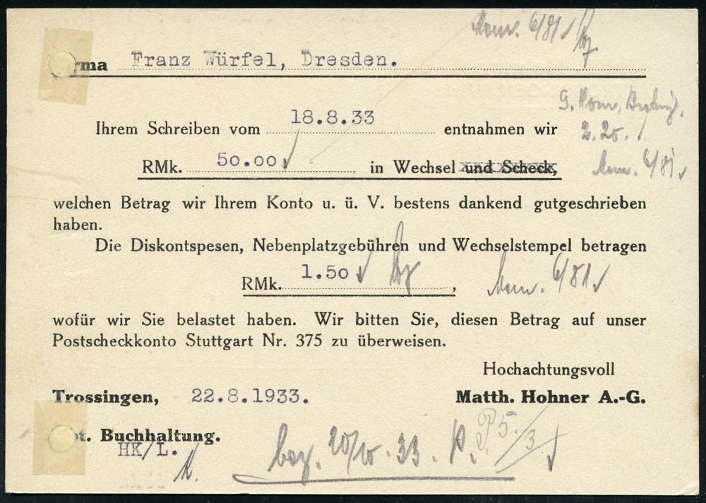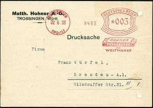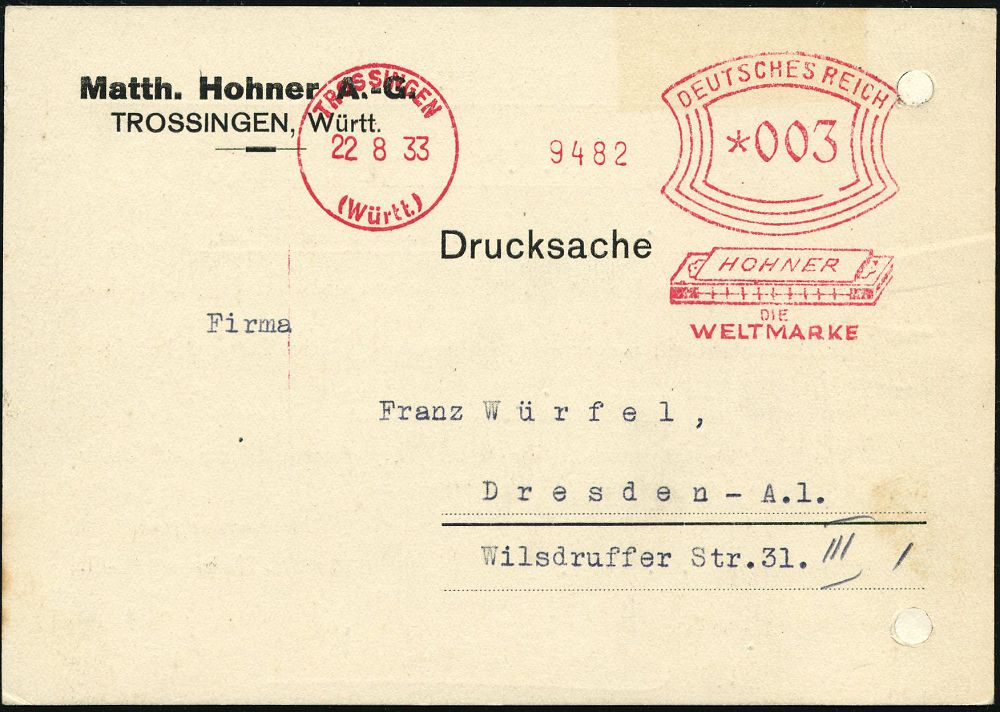 4392 | 16 € | POSTLEITRAUM 7200 (OHNE TUTTLINGEN) : TROSSINGEN/ (Württ.)/ HOHNER/ DIE/ WELTMARKE 1933 (22.8.) AFS Francotyp "Bogenrechteck" = Mundharmonika , Firmen-Kt. (Reg.-Lochung geschl.) : Matth. Hohner AG. (Dü.E-1Am mit Stern) | ![]() ![]() ![]() | |