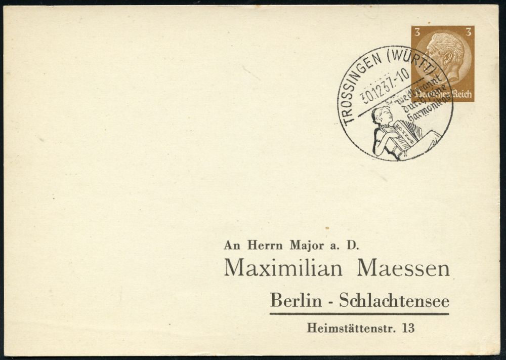 4393 | 20 € | POSTLEITRAUM 7200 (OHNE TUTTLINGEN) : TROSSINGEN (WÜRTT)/ weltbekannt/ durch seine/ Harmonikas 1937 (30.12.) HWSt = Frau mit "Hohner"-Akkordeon auf PP 5 Pf. Hindenbg., braun (M. Maessen) klar gest. Inl.-Karte (Bo.3 = Erstjahr) | ![]() | |