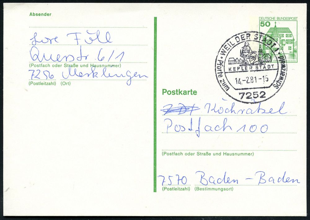 4403 | 5 € | POSTLEITRAUM 7200 (OHNE TUTTLINGEN) : 7252 WEIL DER STADT 1/ KEPLER STADT.. 1981 (14.2.) HWSt = Kepler-Denkmal = Kepler war Hof-Astrologe Wallensteins (u. Astronom, Mathematiker etc.) Bedarfs-Kt. (Bo.3) | ![]() | |