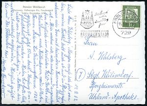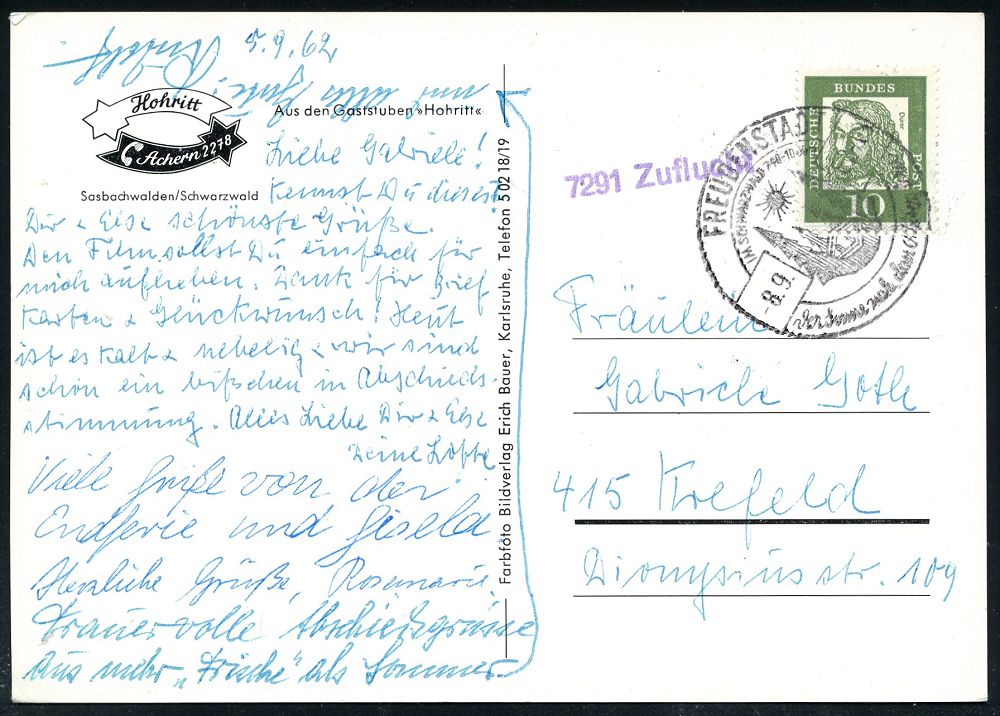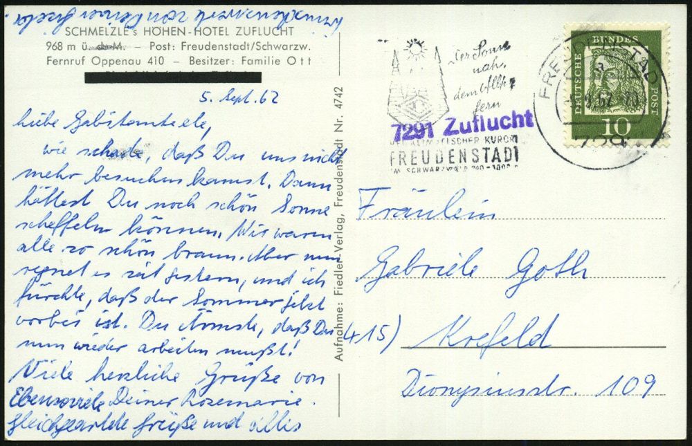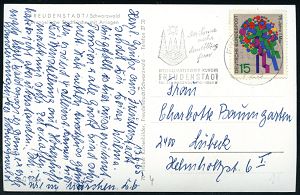 4408 | 15 € | POSTLEITRAUM 7200 (OHNE TUTTLINGEN) : 7291 Zuflucht 1962 (8.9.) viol. 1L = Sonderform PSt.II = Hauspostamt Hotel "Zuflucht" + aptierter HWSt: FREUDENSTADT/IM SCHWARZWALD../der Sonne nah.. = alte PLGZ entfernt, klar gest. Color-Ak.: HOTEL ZUFLUCHT (Gaststube Hohritt) Bedarf (Bo.14 aptiert) | ![]() ![]() | |