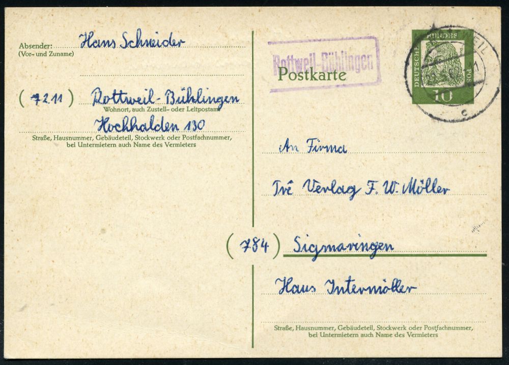 4328 | 18 € | POSTLEITRAUM 7200 (OHNE TUTTLINGEN) : Rottweil-Bühlingen 1962 (22.5.) aptierter Ra. PSt.II u n d aptierter 2K-Steg: ROTTWEIL/c, je alte PLGZ entfernt! , klar gest. Inl.-P 10 Pf.Dürer, seltene Kombination! (Mi.P 60) | ![]() | |