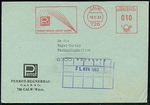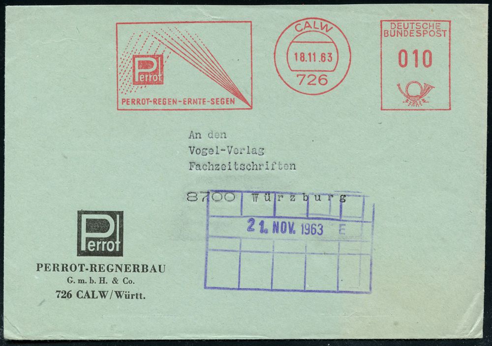 4239 | 12 € | POSTLEITRAUM 7200 (OHNE TUTTLINGEN) : 726 CALW/ PERROT-REGEN-ERNTE-SEGEN 1963 (18.11) AFS Francotyp "Posthorn" (Feld-Beregnung) rs. Abs.-Vordr., klar gest. Fern-Bf. (Dü.E-26) | ![]() | |