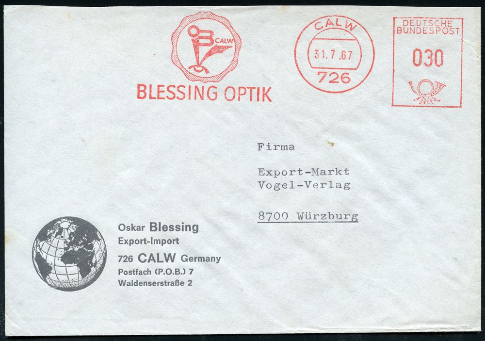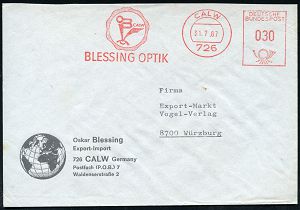 4240 | 10 € | POSTLEITRAUM 7200 (OHNE TUTTLINGEN) : 726 CALW/ BLESSING OPTIK 1967 (31.7.) AFS Francotyp "Posthorn" (Logo mit Auge) klar gest. Firmen-Bf.: Oskar Blessing.. (Globus) (Dü.E-26) | ![]() | |