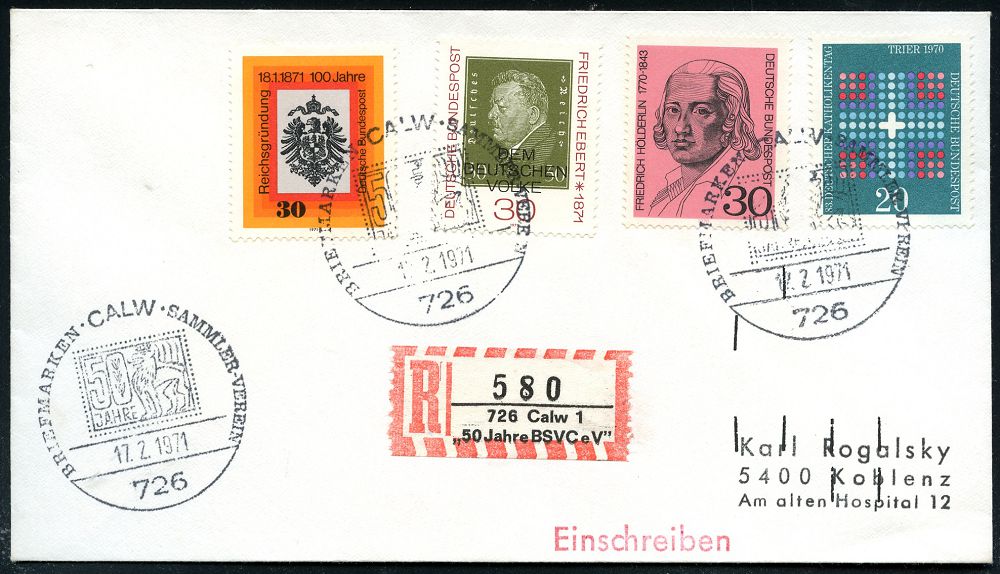 4242 | 18 € | POSTLEITRAUM 7200 (OHNE TUTTLINGEN) : 726 CALW/ 50 JAHRE/ BSV 1971 (17.2.) 3x SSt + Sonder-RZ: 726 Calw 1/"50 Jahre BSV eV" (NEZ-Nr.106) + schw. Matrix-Codierung = Sortieranlage AEG-Telefunken Fern-R-Bf. (Bo.6) | ![]() | |