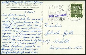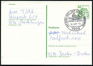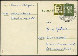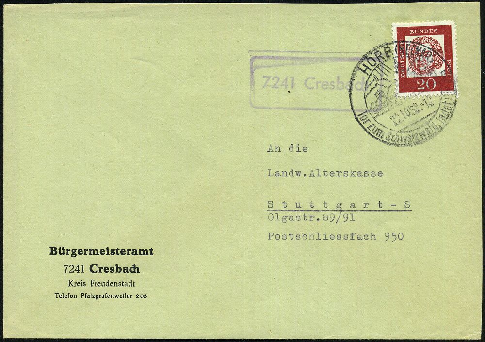 4244 | 12 € | POSTLEITRAUM 7200 (OHNE TUTTLINGEN) : 7241 Cresbach 1962 (22.10.) viol. Ra.2 = PSt.II + aptierter HWSt: HORB (NECKAR)/Tor zum Schwarzwald = PLGZ entfernt , Bürgermeister-Bf. (Bo.1 aptiert) | ![]() | |