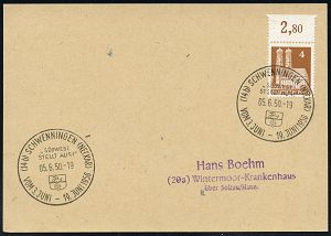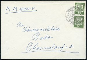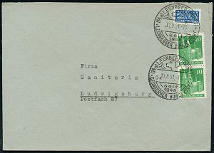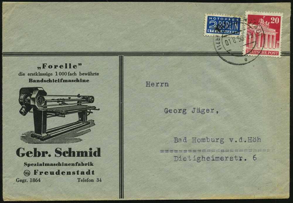 4265 | 15 € | POSTLEITRAUM 7200 (OHNE TUTTLINGEN) : (14b) FREUDENSTADT/ e 1950 (1.8.) 2K-Steg auf Bauteen 20 Pf. + 2 Pf. NoB, Reklame-Bf.: "Forelle" Banschleifmaschine Gebr. Schmid | ![]() | |