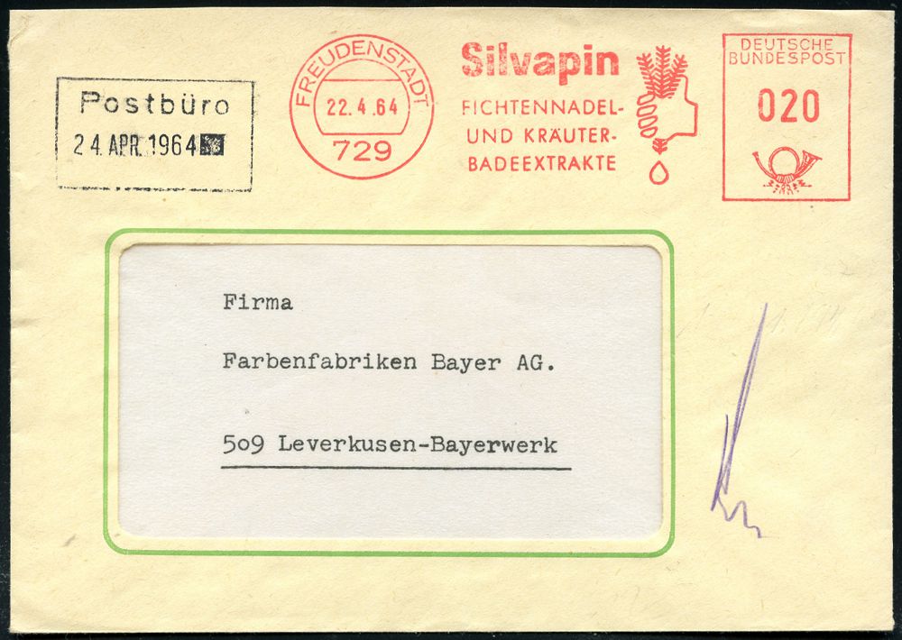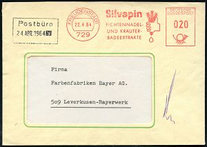 4273 | 12 € | POSTLEITRAUM 7200 (OHNE TUTTLINGEN) : 729 FREUDENSTADT/ Silvapin/ FICHTENNADEL-/ u.KRÄUTER/ BADEEXTRAKTE 1964 (22.4.) AFS Francotyp "Posthorn" (Hand preßt aus Tannenzweig Essenztropfen) klar gest. Fern-Bf. (Dü.E-23CO) | ![]() | |