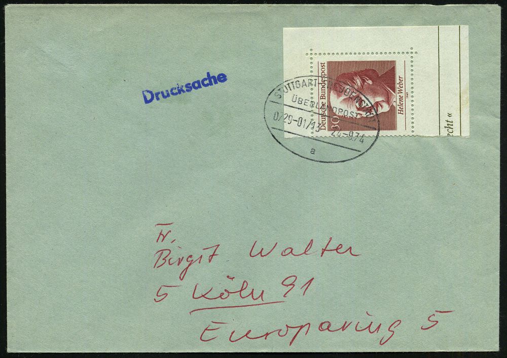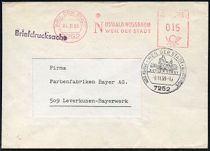 4401 | 15 € | POSTLEITRAUM 7200 (OHNE TUTTLINGEN) : 7252 WEIL DER STADT/ OSWALD NUSSBAUM.. 1965 (4.11.) AFS Francotyp "Posthorn" 015 Pf. + HWSt: 7252 WEIL DER STADT/ KEPLERSTADT.. (Kepler-Denkmal) vorschriftsmäßig vom 8.11., da im Freistempels falsche Datumsangabe !, seltene Kombination! (Bo.3) | ![]() | |