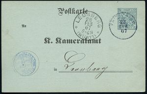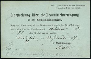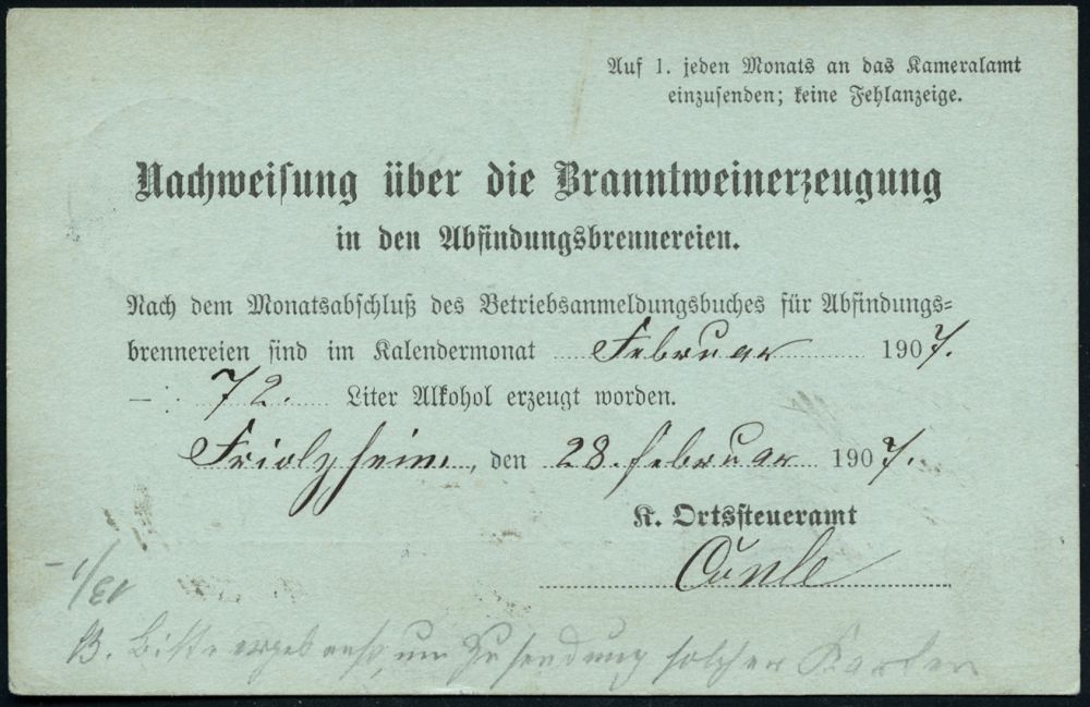 4289 | 30 € | POSTLEITRAUM 7200 (OHNE TUTTLINGEN) : LEONBERG 1907 (23.2.) !K als Ank,-Stpl. auf Dienst-P 2 Pf. Ziffer "Kameralamt", grau + rs. Zudruck: Nachweisung über d. Brannt-weinerzeugung in d. Abfindungsbrennereien aus Friolzheim, Bedarf selten! (Mi.DPB 1 b) | ![]() ![]() | |