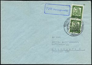 4282 | 11 € | POSTLEITRAUM 7200 (OHNE TUTTLINGEN) : 7291 Herzogsweiler 1962 (7.7.) blauer Ra = PSt.II + aptierter HWSt: FREUDENSTADT/IMSCHWARZWALD.. = PLGZ entfernt , gering verkürzter Fern-Bf. (Bo.14, aptiert) | ![]() | |