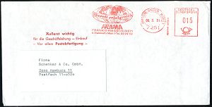 4285 | 8 € | POSTLEITRAUM 7200 (OHNE TUTTLINGEN) : 7251 HIRSCHLANDEN,WÜRTT/ GEBÜHR BEZAHLT/ überall erfolgreich/ FRAMA/ FRANKIERMASCHINEN/ 6 Frankfurt-Main.. 1974 (März) AFS Francotyp 015 Pf. (Globus) Inl.-Bf. (Dü.E-26) | ![]() | |