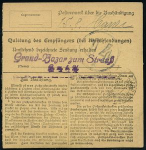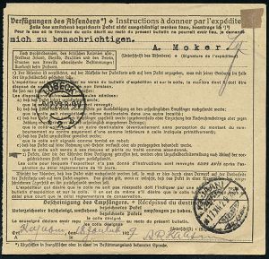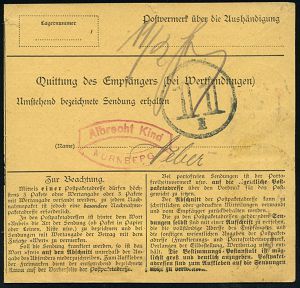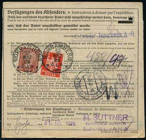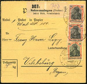 4350 | 20 € | POSTLEITRAUM 7200 (OHNE TUTTLINGEN) : SCHWENNINGEN/ *(NECKAR)/ f 1919 (14.3.) 1K-Brücke 3x auf Germania 25 Pf. u. 2x 30 Pf. + schw. Selbstbucher-Paketzettel: Schwenningen (Neckar)/Jakob Bürk, Schäftefabrik , Inl.-Wertpaket-Kt. 100.- Mk. n. Vilsbiburg (Mi.88 II, 2x 89 II) | ![]() | |