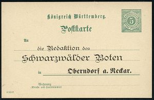 4309 | 18 € | POSTLEITRAUM 7200 (OHNE TUTTLINGEN) : Oberndorf 1897 amtl. P 5 Pf. Ziffer, grün + vs. Vordruck: ..Redaktion des Schwarzwälder Boten , ungebr. (Mi.PZD 37) | ![]() | |