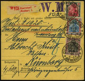 4310 | 20 € | POSTLEITRAUM 7200 (OHNE TUTTLINGEN) : OBERNDORF/ **/ AM NECKAR 1921 (9.2.) 1K 3x auf 3-Farben-Frankatur Germania 50 Pf., 2 Mk. u. 4 M. + roter Wert-paketzettel: Oberndorf/(Neckar) 1 + viol. 1L: W. M., Inl.-Wertpaketkt. 1920.- M. (Mi.91 II, 152/53) | ![]() ![]() | |