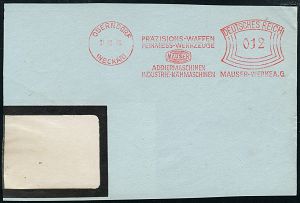 4312 | 15 € | POSTLEITRAUM 7200 (OHNE TUTTLINGEN) : OBERNDORF/ (NECKAR)/ PRÄZISIONS-WAFFEN/ FEINMESS-WERKZEUGE/ MAUSER.. 1936 (31.10.) AFS Francotyp "Bogenrechteck" (Logo) klar auf Teil-Vorderseite = führender Handfeuerwaffen-Hersteller, z.B. P 38 etc. (Dü.E-1CE) | ![]() | |