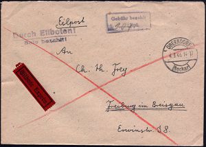 4314 | 16 € | POSTLEITRAUM 7200 (OHNE TUTTLINGEN) : OBERNDORF/ (Neckar) 1946 (4.3.) 1K-Brücke + viol. Ra.2: Gebühr bezahlt/___ Rpf. + hs. "104", Inl.-R-Bf. n. Freiburg (Richter Nr.2505) | ![]() | |