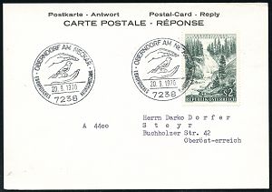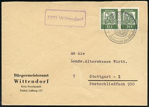 4404 | 14 € | POSTLEITRAUM 7200 (OHNE TUTTLINGEN) : 7291 Wittendorf 1962 (6.7.) viol. Ra = PSt.II + aptierter HWSt: FREUDENSTADT/IM SCHWARZWALD.. (alte PLGZ entfernt) Kommunalbf.: Bürgermeisteramt Wittendorf.. (Bo.14 aptiert) | ![]() | |