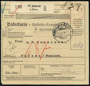 4324 | 23 € | POSTLEITRAUM 7200 (OHNE TUTTLINGEN) : ROTTWEIL/ **/ Gebühr bezahlt 1929 (5.12.) 1K-Brücken Hand-Paket-FS + schw. Selbstbucher-Paketzettel: III Rottweil/A. Moker , klar gest. Ausl.-Paketkt. n.Finnland, rs. AS. (Dü.23) | ![]() ![]() | |